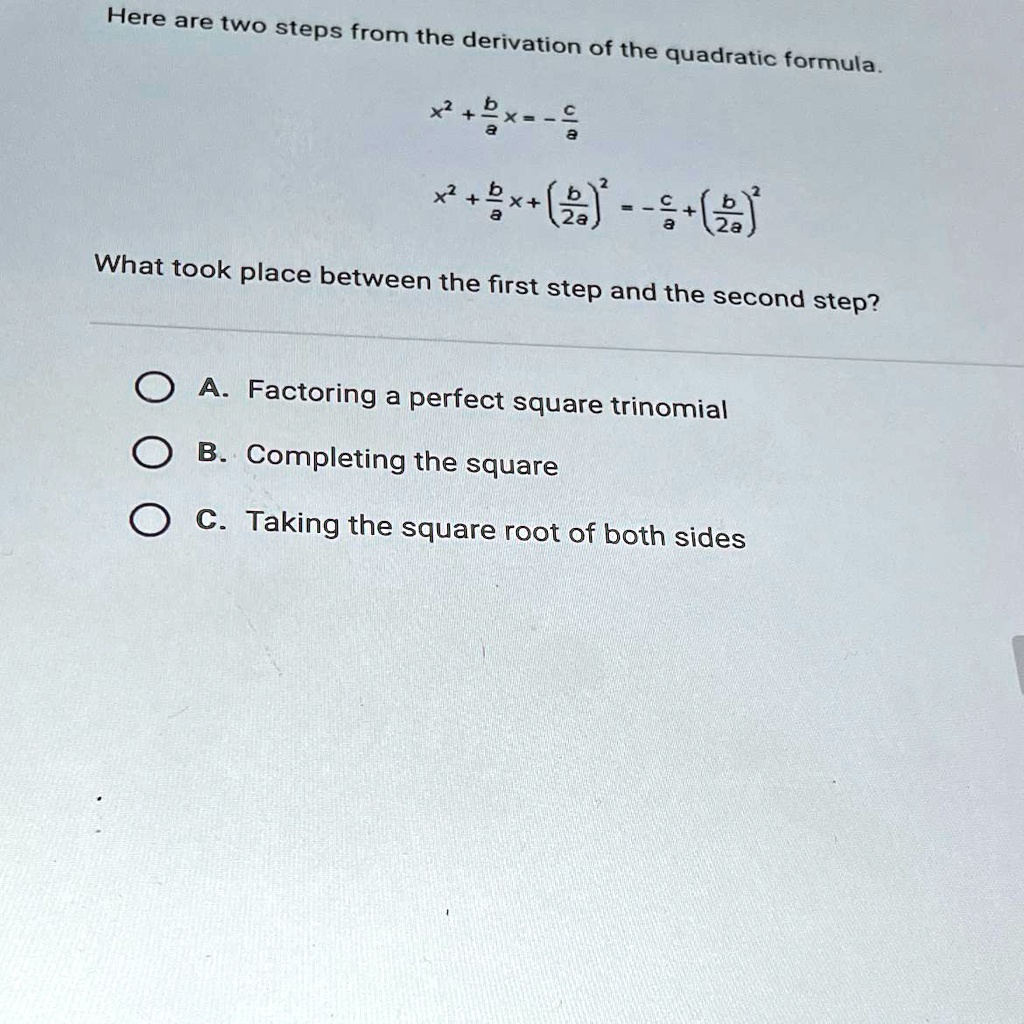 Solved Here Are Two Steps From The Derivation Of The Quadratic Formula Second Step Help Bro Here Are Two Steps From The Derivation Of The Quadratic Formula Bx 5 X 8 3 8 2